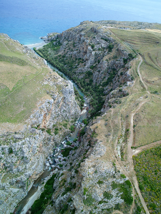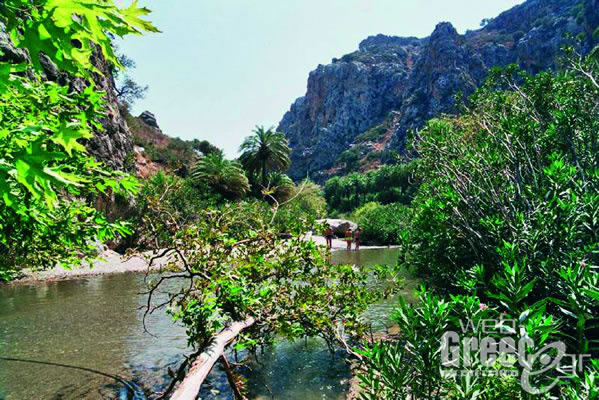 Preveli Gorge. Here the river Megapotamos flows between the high banks of the gorge and through the palm-forest to the beautiful Limni beach.